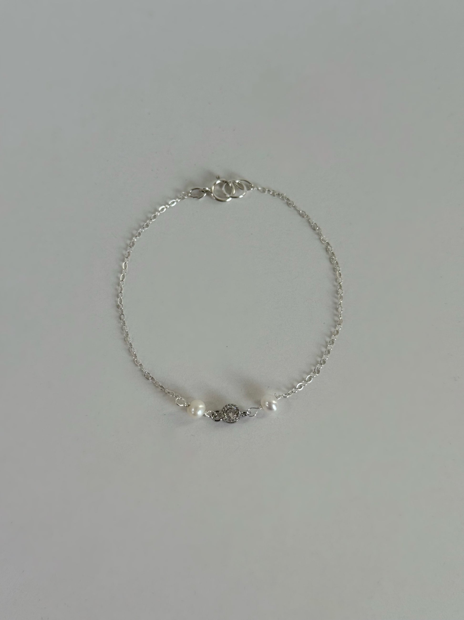 Crafted from fine sterling silver, the bracelet features a dainty chain that is both lightweight and durable. At its center lies a round pavé cubic zirconia stone, flanked by two tiny freshwater pearls, creating a shimmering, refined effect that catches the light beautifully.The bracelet is secured with a spring ring clasp for easy wear, and it is available in three lengths to ensure a perfect fit. Whether worn alone or stacked with other delicate pieces, the Lina Bracelet is a versatile and timeless addition to any jewellery collection.