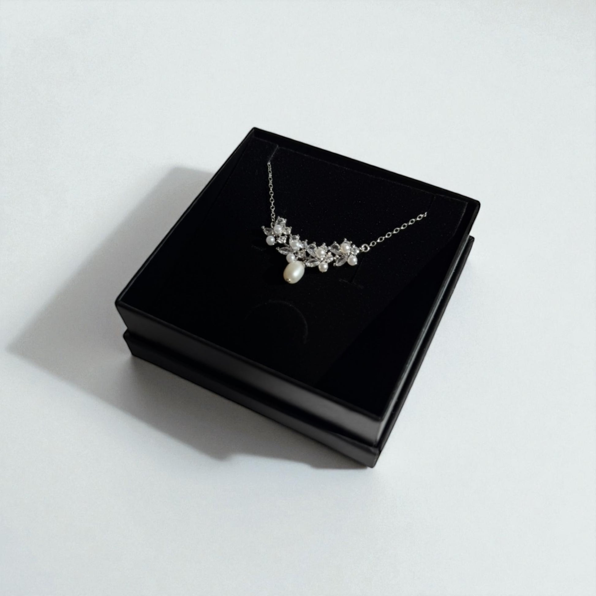 This exquisite necklace features sparkling floral cubic zirconia connectors, each delicately adorned with small, lustrous white pearls. These shimmering details lead gracefully to a teardrop freshwater pearl at the centre, forming a soft, elegant V-shaped pendant that captures light beautifully.
